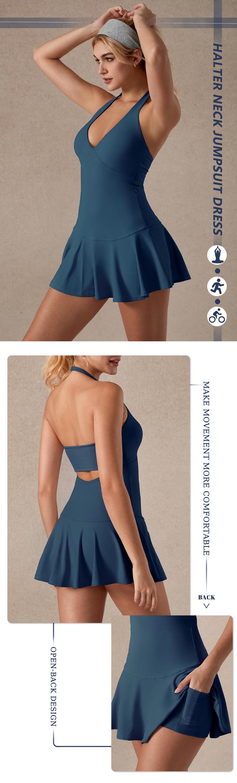 This halter backless sporty dress is designed for women who value both performance and comfort. With its sleek athletic style, soft stretch fabric, and practical hidden pockets, it offers the perfect blend of fashion and function—whether you’re on the tennis court, in the yoga studio, at the gym, or enjoying casual outdoor activities.